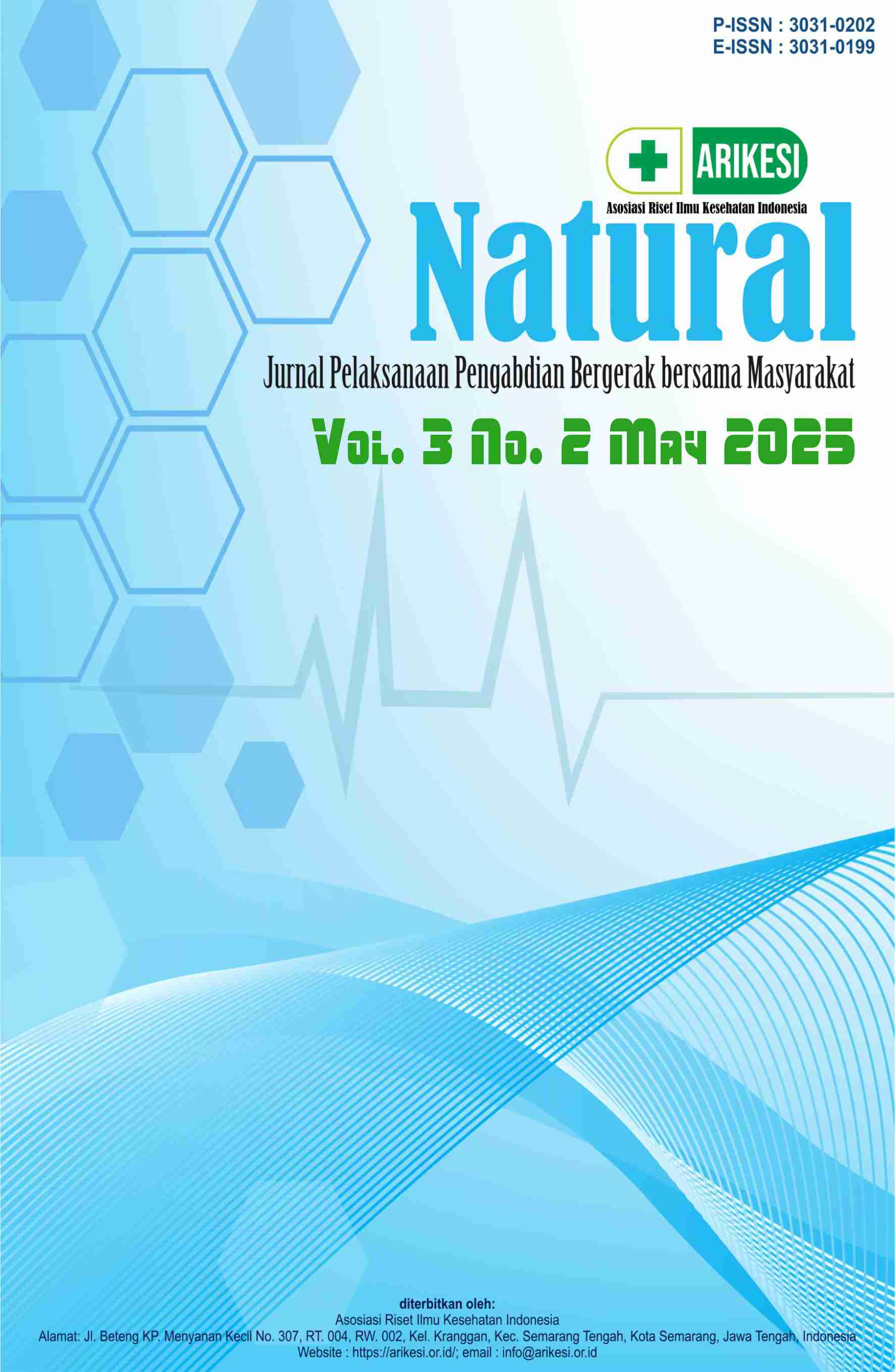 Natural: Jurnal Pelaksanaan Pengabdian Bergerak bersama Masyarakat, this journal is published by the Asosiasi Riset Ilmu Kesehatan Indonesia which has E-ISSN Number: 3031-0199 and P-ISSN: 3031-0202 Focus and Scope in the fields of education, law, economics, humanities , Engineering, Agriculture, Communication, Health, and Engineering. Natural: Jurnal Pelaksanaan Pengabdian Bergerak bersama Masyarakat Implementation contains publication of the results of Community Service and Service activities, models or concepts and or their implementation in the context of increasing community participation in development, community empowerment or implementation of community service. This journal is published 1 year 4 times (February, May, August and November)
